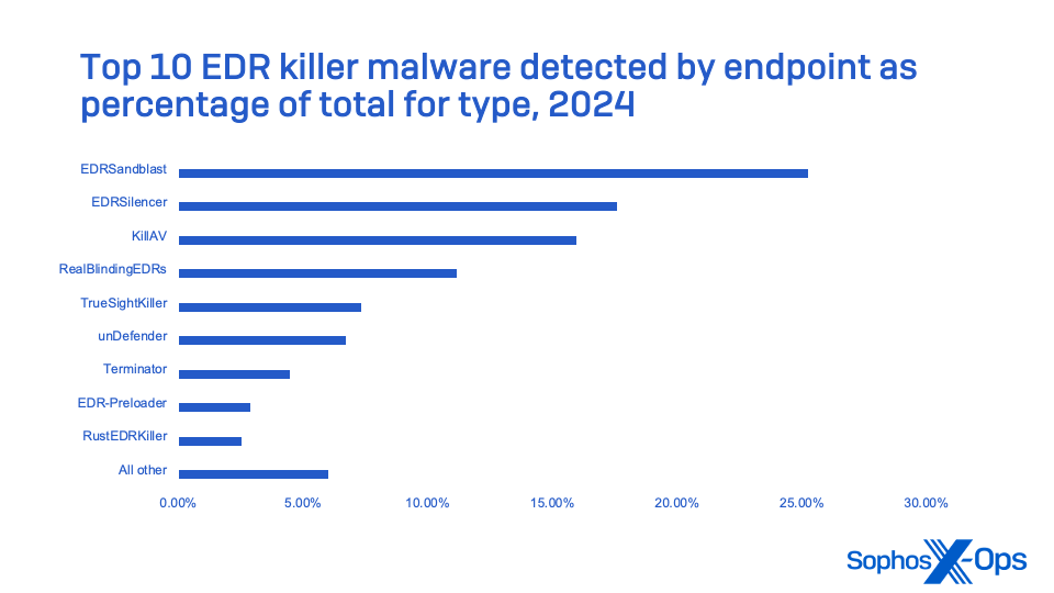 Sophos X-Ops saw a variety of would-be EDR killers used by ransomware actors in 2024. The most frequently seen of these was EDRSandBlast, a tool used by multiple actors. Seen in both MDR and Incident Response cases, EDRSandBlast variants were detected in waves of attempted ransomware attacks throughout the year, including a dramatic peak around the US Thanksgiving holiday in November.