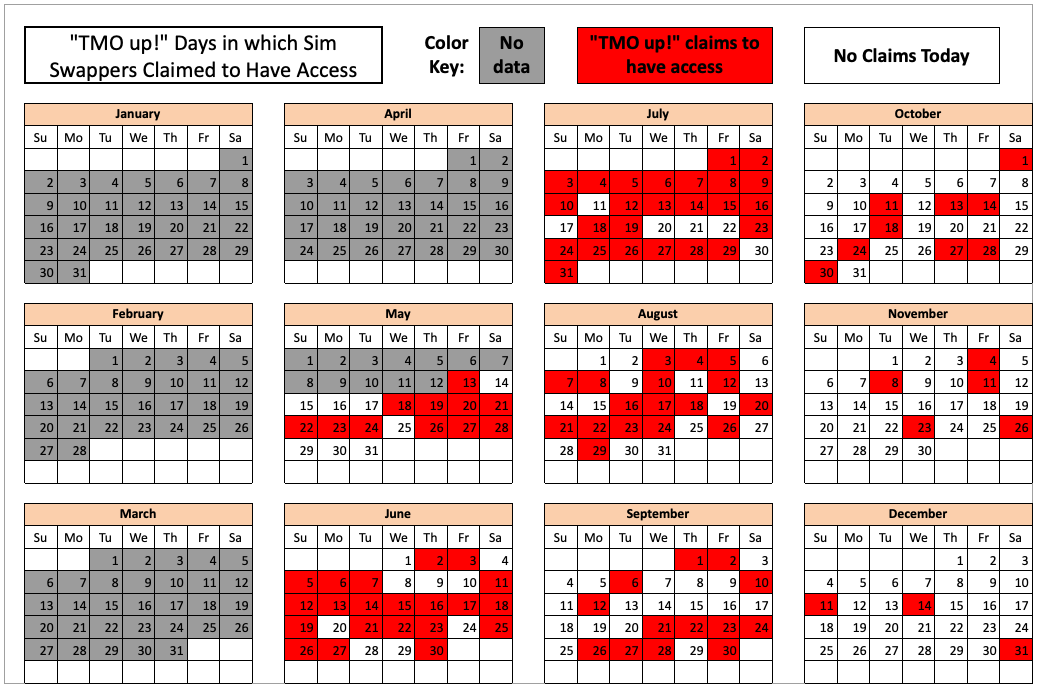 The 104 days in the latter half of 2022 in which different known SIM-swapping groups claimed access to T-Mobile employee tools. Star Chat was responsible for a majority of these incidents. Image: krebsonsecurity.com.