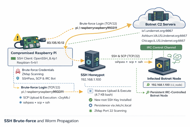 This incident demonstrates how a raspberry pi device with no security configurations can be converted into a fully weaponized botnet zombie. It serves as a reminder that security hardening is essential, even for small Linux devices and hobbyist systems.