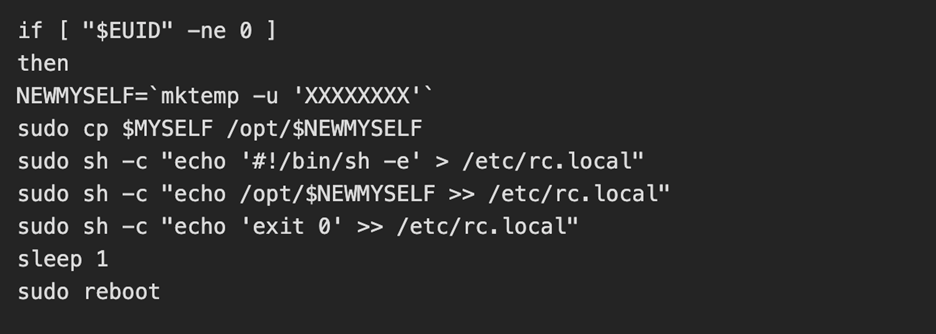 The uploaded and executed script was a 4.7KB bash script captured by the DShield sensor. The script performs a full botnet lifecycle. The first action the script takes is establishing persistence by performing the following: