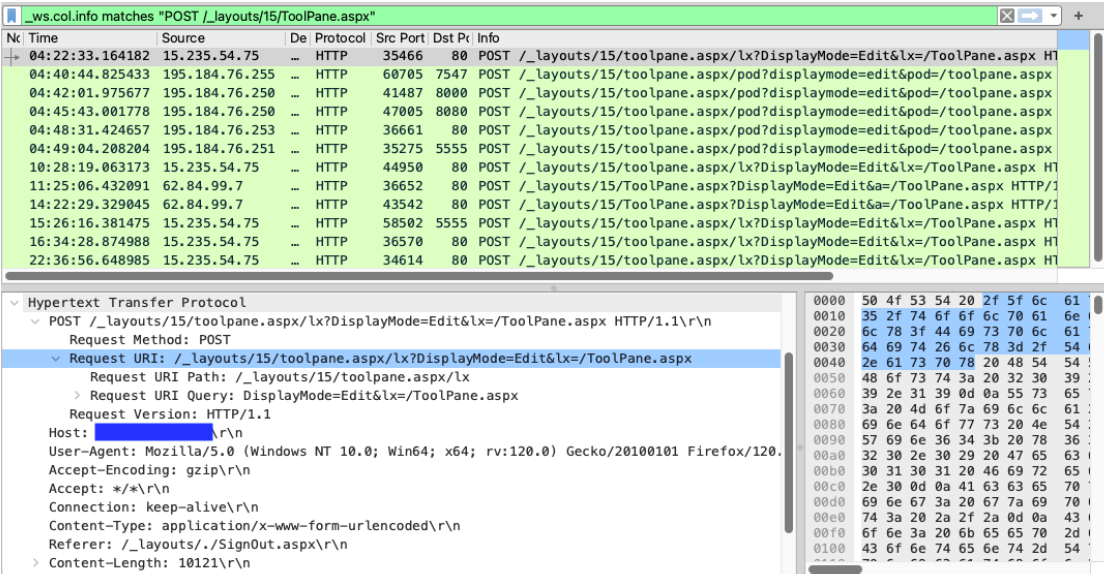 Figure 4: Wireshark displaying packets containing POST requests to the URL /_layouts/15/ToolPane.aspx.