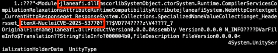The Project Discovery Nuclei Scanner, when using the http template CVE-2025-53770, sends the payload in Figure 9. This payload contains the .NET Dynamic-link Library (DLL) binary named jlaneafi.dll. If the SharePoint server is vulnerable, an additional HTTP response header of X-Nuclei is returned with a value of CVE-2025-53770 [10].