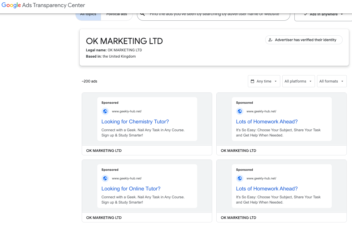 Google’s Ads Transparency page for current Nerdify advertiser OK Marketing LTD.