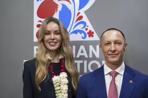 Synergy University President Vadim Lobov (right) pictured this week in India next to Natalia Popova, a Russian TV presenter known for her close ties to Putin’s family, particularly Putin’s daughter, who works with Popova at the education and culture-focused Innopraktika Foundation.
