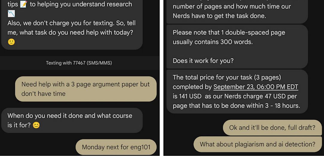 “We tested the quick SMS for a price quote,” wrote This Isn’t Fine author Joseph Thibault. “The honor code references and platitudes apparently stop at the website. Within three minutes, we confirmed that a full three-page, plagiarism- and AI-free MLA formatted Argumentative essay could be ours for the low price of $141.”
