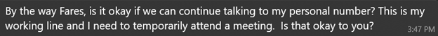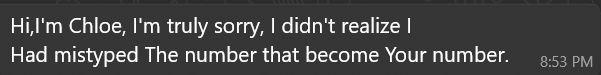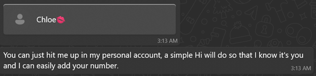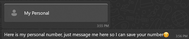 The excuse is plausible and low-friction. Once texting the new number, writing style often changes ? a strong sign of a hand-off to a different operator or team focused on long-term grooming.