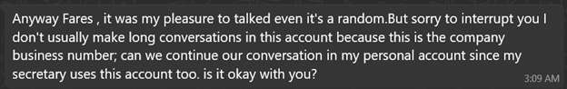 I was contacted by two separate romance scammers on WhatsApp. I acted like a victim falling for their scam and spent around two weeks texting each one. This allowed me to observe the first few phases, which we discuss below. I was not able to reach the monetization phase, as that often takes months and I could not maintain the daily time investment needed to convince the scammers I was fully falling for it.