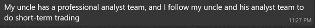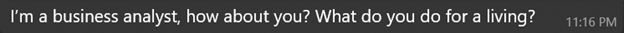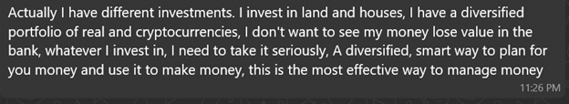 Both claim the same job ? Business Analyst ? which later supports credibility when discussing investments. Claiming to be foreigners explains grammatical errors and factual mistakes about the UK. Notably, job descriptions are long and well-written, lacking earlier quirks ? suggesting prewritten, copy-pasted content. This points to a playbook: flatter the target, establish credibility with occupation and location cover, then use scripted replies where legitimacy matters.