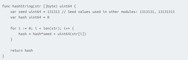 The hashing algorithm is shown below. The two variants of the seed value provided in the comment are used in the shellcodes and the final payload of the attack.
