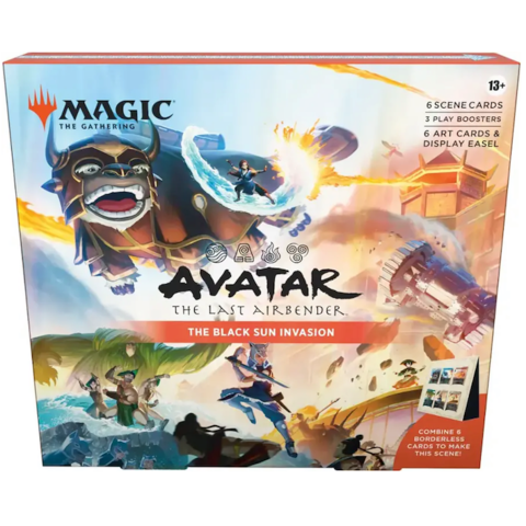 The Black Sun Invasion Scene Box is based on Team Avatar’s attempt to breach the Fire Nation capital and take out Fire Lord Ozai. Inside the box, you’ll find six Traditional Foil Borderless Scene Cards and six art-only Scene Cards to attach to the paper display easel and form a complete scene. The Scene Box also comes with three Play Booster Packs.